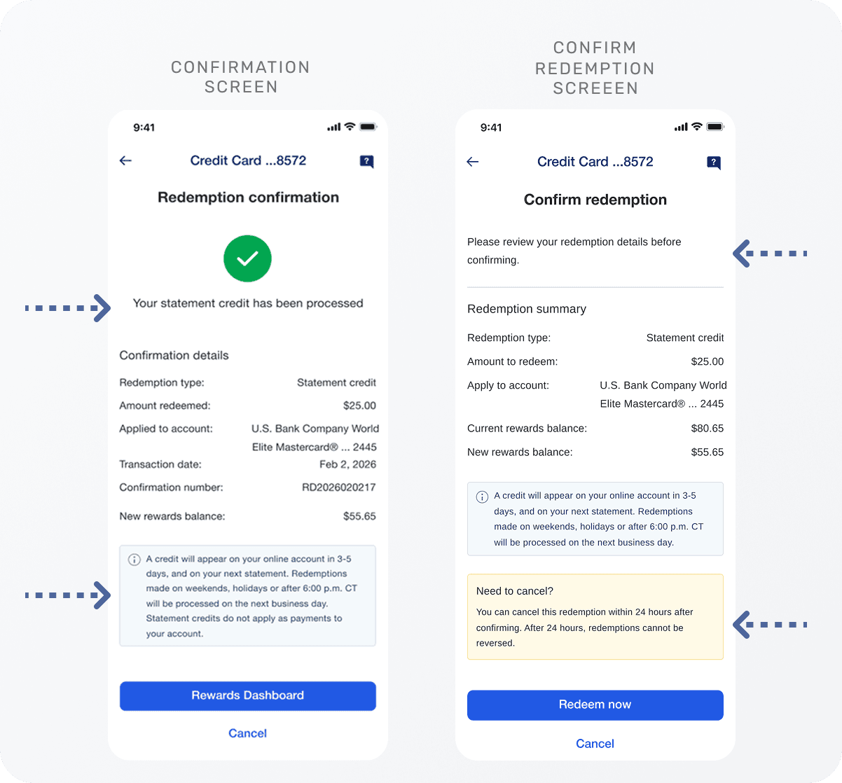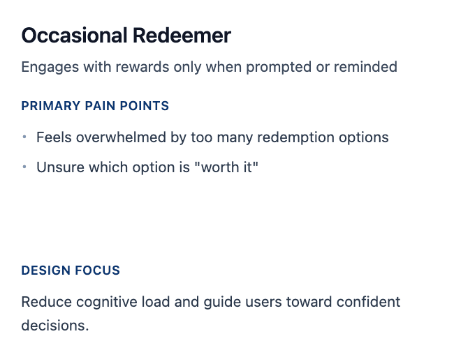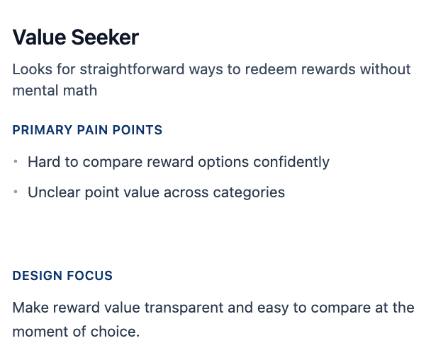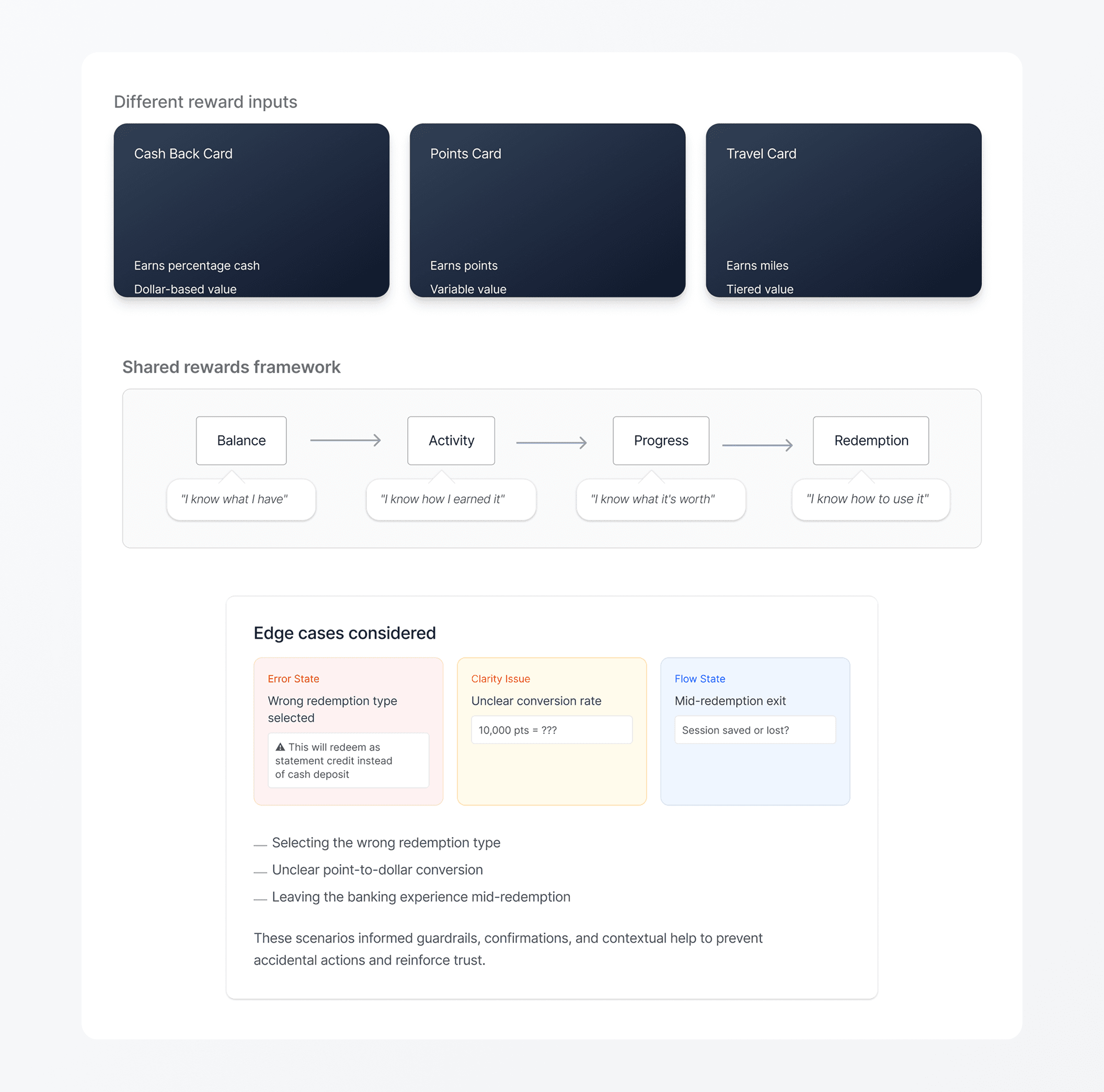 By focusing on confidence at high-risk decision moments, the redesigned rewards experience reduced hesitation during redemption and made value easier to understand across different card types.