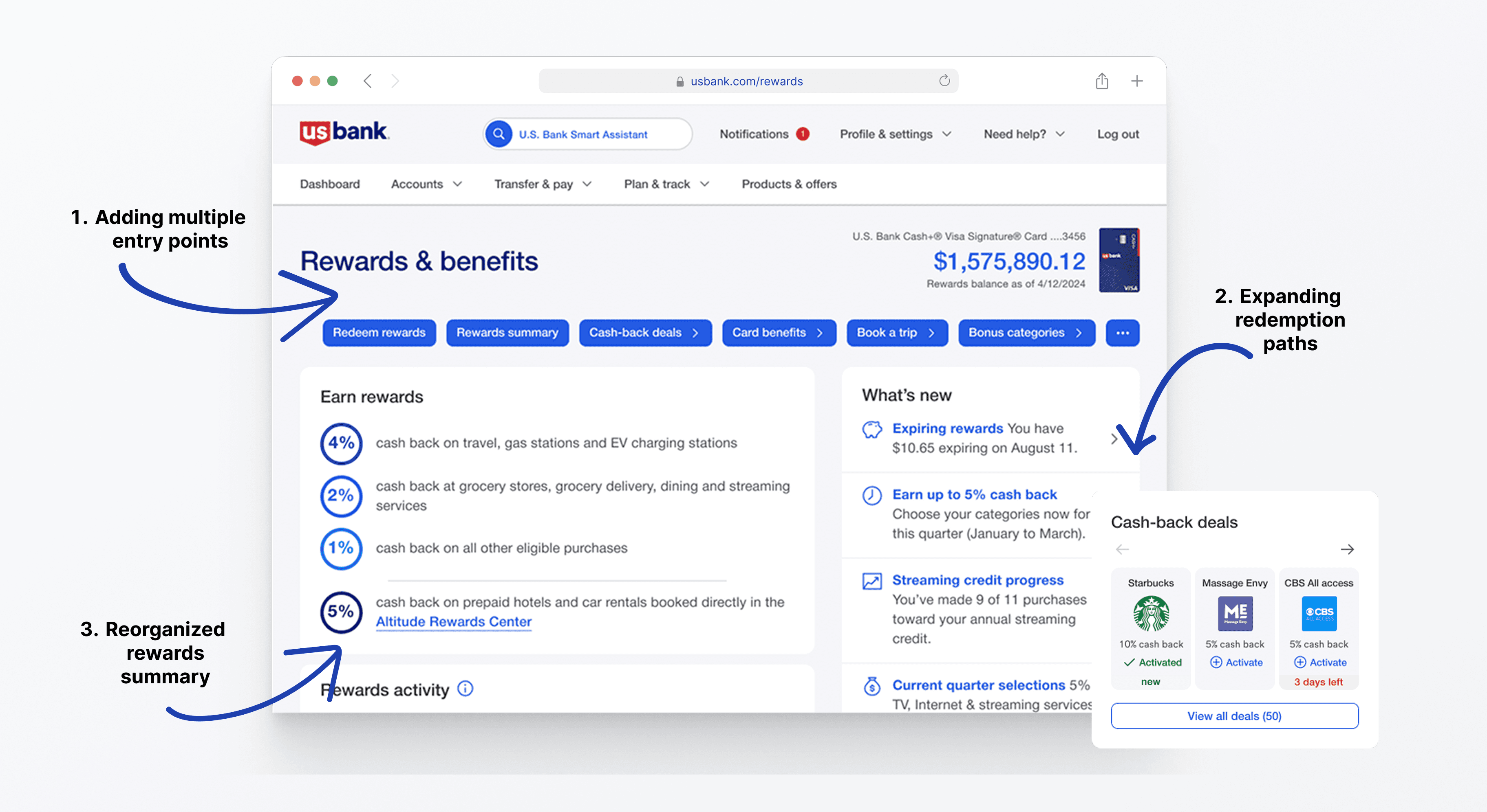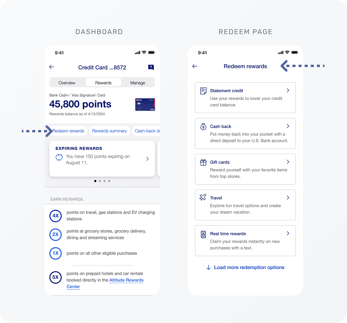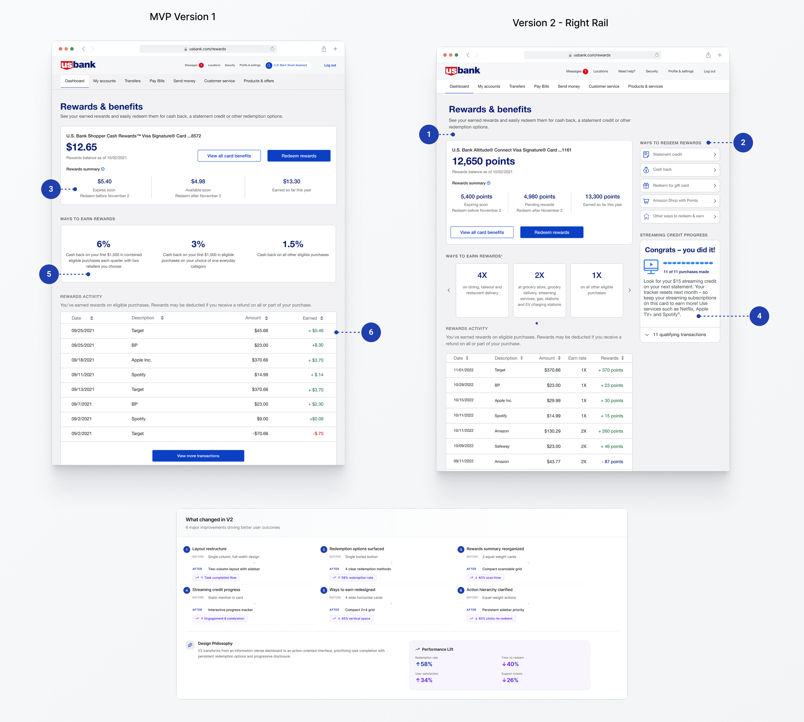 I led the end to end design of U.S. Bank’s first internal rewards dashboard, transforming a fragmented third-party redemption experience into a predictable, confidence-building system that customers could actually use.
