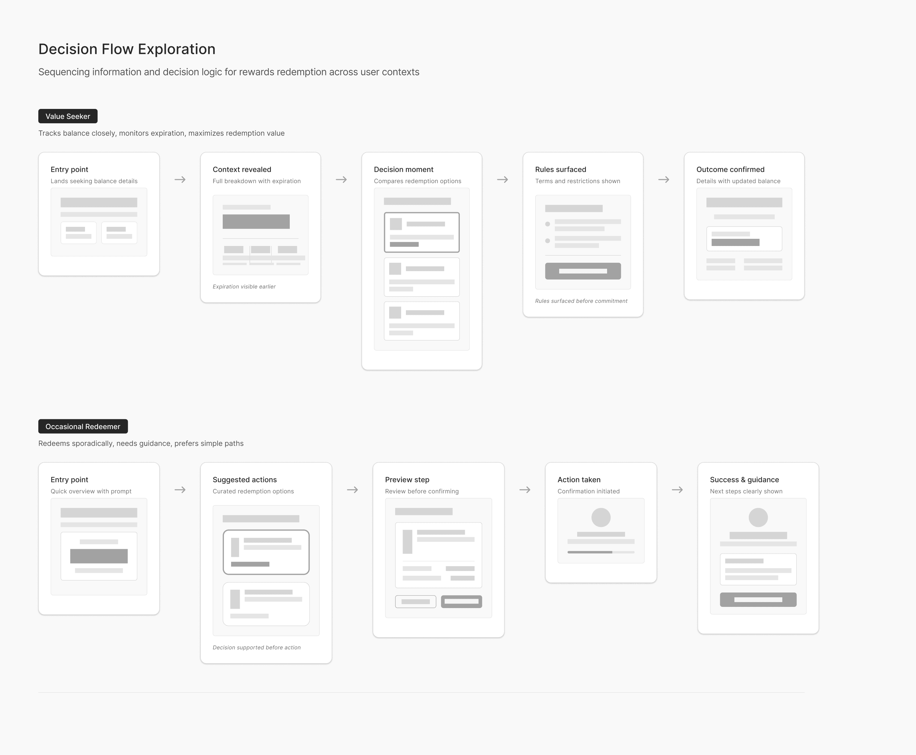 Before designing screens, I mapped how users reason about rewards including hesitation points and edge cases that cause drop-off.